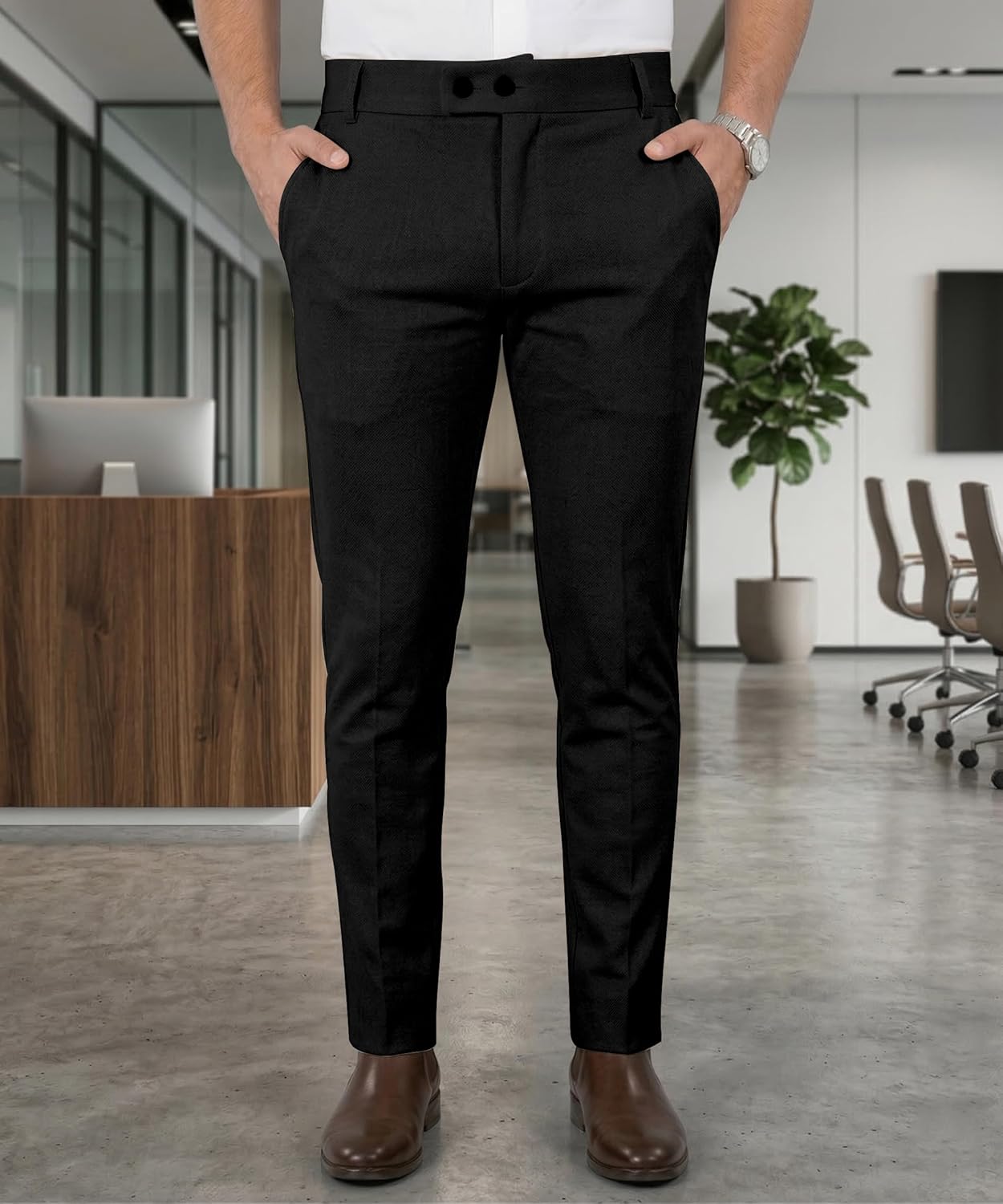 Elevate your professional wardrobe with these sleek and sophisticated men’s slim fit dress pants in a timeless black hue. Crafted from premium fabric.